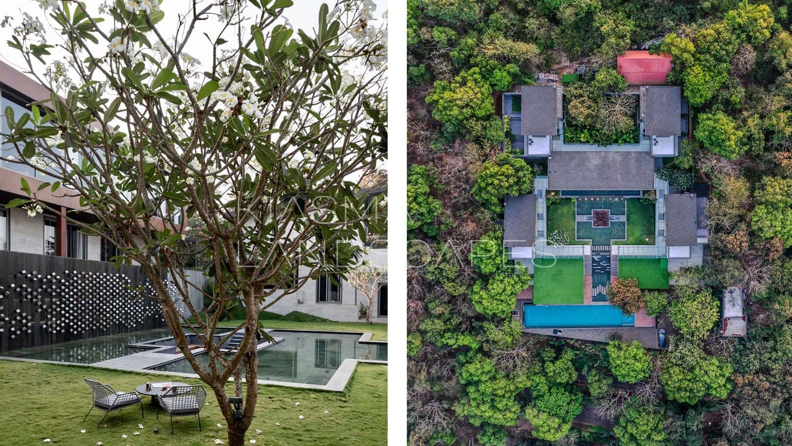 An abode in the forest. This luxury vacation home is located on a hill, which called for very sensitive landscape development. The water bodies act as the key element tying the built to the landscape.